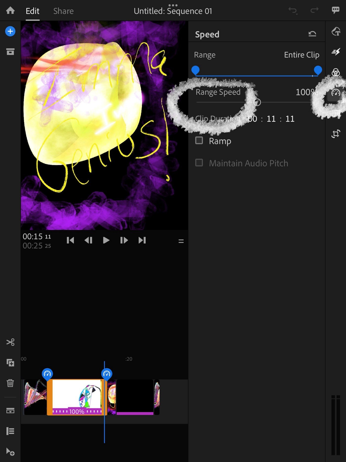 To change the frame rate, save your D.A.W. on your iPad, open Premiere Rush, and upload your D.A.W. Make sure your footage is selected on the timeline at the bottom of the app. Then, click the speedometer dial on the right toolbar, and some options will pop out. Next, toggle the "Range Speed" slider to your preferred frame rate. Replay to verify the rate is what you want. Finally, hit "share" and export: